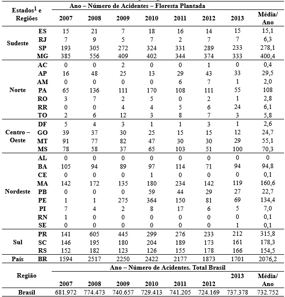 Conforme o AEAT (2014), o Brasil contabilizou no período observado, de 2007 a 2013, 5.129.267 acidentes do trabalho. Dentre o total de acidentes ocorridos nas atividades florestais, 14.532 envolveram as de produção florestal - Floresta Plantada, que estão agrupados no CNAE com código 02.10 e geraram 298 incapacidades permanentes e 69 óbitos.