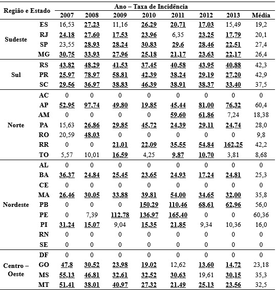São observados na Tabela 2, a TI de acidentes em florestas plantadas em todos os estados Brasileiros, e um comparativo com a média estadual de 2007 a 2013. A tabela apresenta os valores de taxa de frequência média por estado nos anos da pesquisa e na última coluna é estabelecida uma média dos 7 anos pesquisados, com destaque (em negrito e sublinhado) nos períodos quando a atividade pesquisada apontou maior índice em comparação com a média do estado.