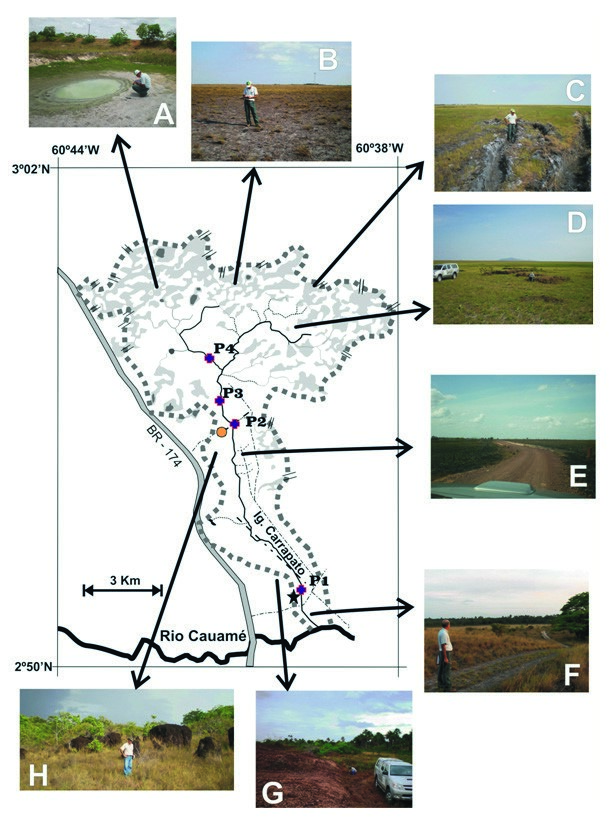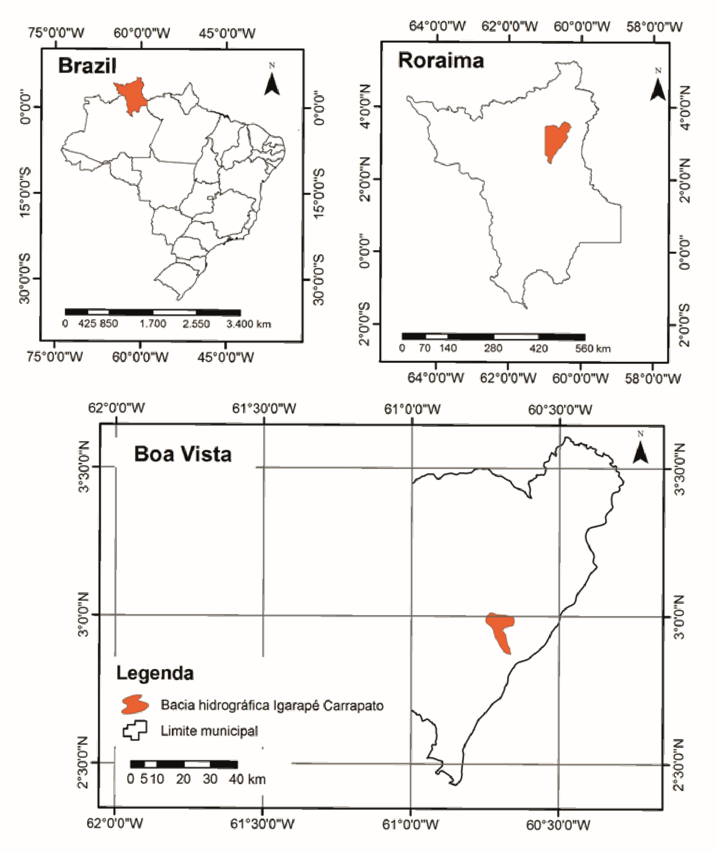 A área de estudo é a bacia do Igarapé Carrapato, localizada no município de Boa Vista, Roraima (Figura 1). O igarapé Carrapato é tributário da margem esquerda do rio Cauamé, que é afluente da margem direita do rio Branco. As nascentes da bacia situamse junto à drenagem de diversos lagos intermitentes da savana.