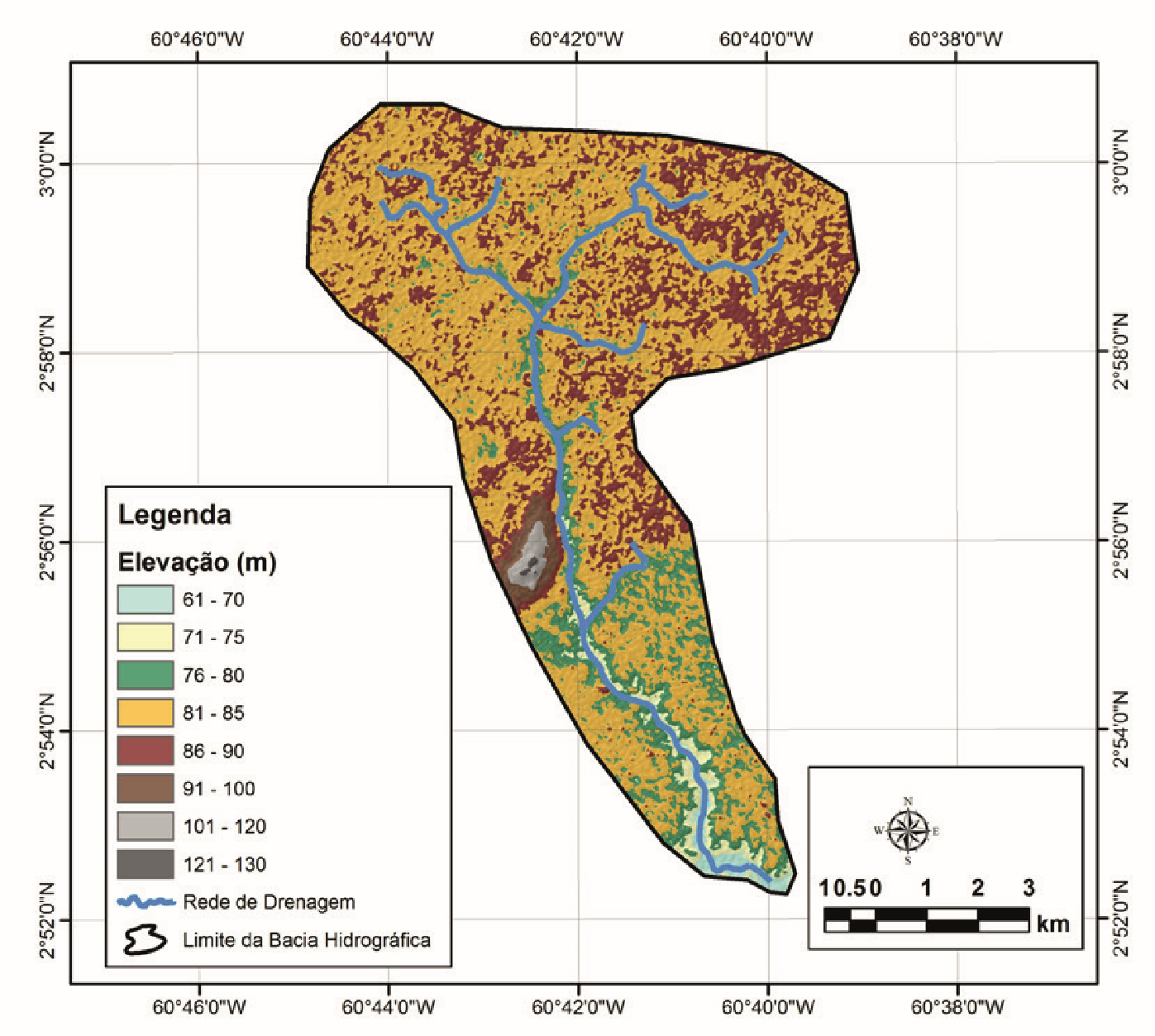 A altitude mínima, máxima e média foi obtida a partir do MDE, e a declividade média foi obtida a partir do modelo de declividade gerado com base no MDE. O perímetro e a área foram calculados com base no limite da bacia. O ordenamento dos cursos d’água da bacia foi realizado empregando-se a metodologia estabelecida por Strahler (1957).
