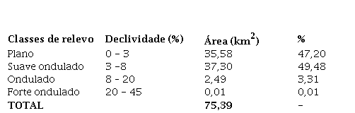 A declividade média da bacia é de 3,5%, caracterizando o relevo como sendo plano, existindo algumas variações devidas à formação geológica, apresentando afloramentos de basalto caracterizando os pontos altos e, nas regiões mais planas, arenitos e solos síltico-arenosos da Formação Boa Vista. Na desembocadura da bacia, a presença de terraços lateríticos controla a topografia, formando um terreno levemente acidentado. Esses parâmetros são importantes e possuem grande influência sobre o escoamento superficial com consequências sobre o processo de erosão hídrica do solo, resultando em perda de água e nutrientes, que podem vir a provocar o assoreamento e eutrofização dos corpos d’água.