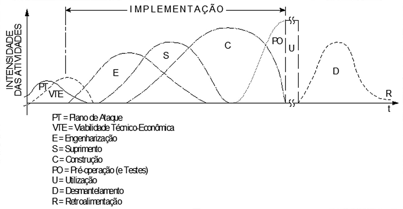 - aquisição de todos os materiais e equipamentos necessários à materialização do projeto, bem como controle da respectiva qualidade e prazos de fabricação e, ainda coordenação do transporte e da entrega dos mesmos no local de sua implantação. Nesta etapa supre-se o projeto com recursos necessários à sua execução, sendo por isso denominada etapa de suprimentos; na etapa de construção materializa-se o modelo criado na fase de Engenharização, aplicando-se os materiais e montando-se os equipamentos adquiridos na fase de Suprimento, utilizando mão-de-obra adequadamente treinada e tecnologia apropriada; Pré-operação – fase caracterizada pelo início de funcionamento [...]; Operação ou Utilização– fase em que o produto construído é utilizado, necessitando, entretanto, de manutenção para que continue atendendo satisfatoriamente as suas necessidades; Desmobilização, Disposição ou Desmantelamento – fase em que o produto construído chega ao fim de sua vida útil, sendo, então abandonado se não for prejudicial ao homem ou ao meio ambiente; caso contrário, é preciso desmobilizá-lo ou desmantelá-lo, acondicionar suas partes e delas dispor de forma que não agridam o homem nem a natureza.