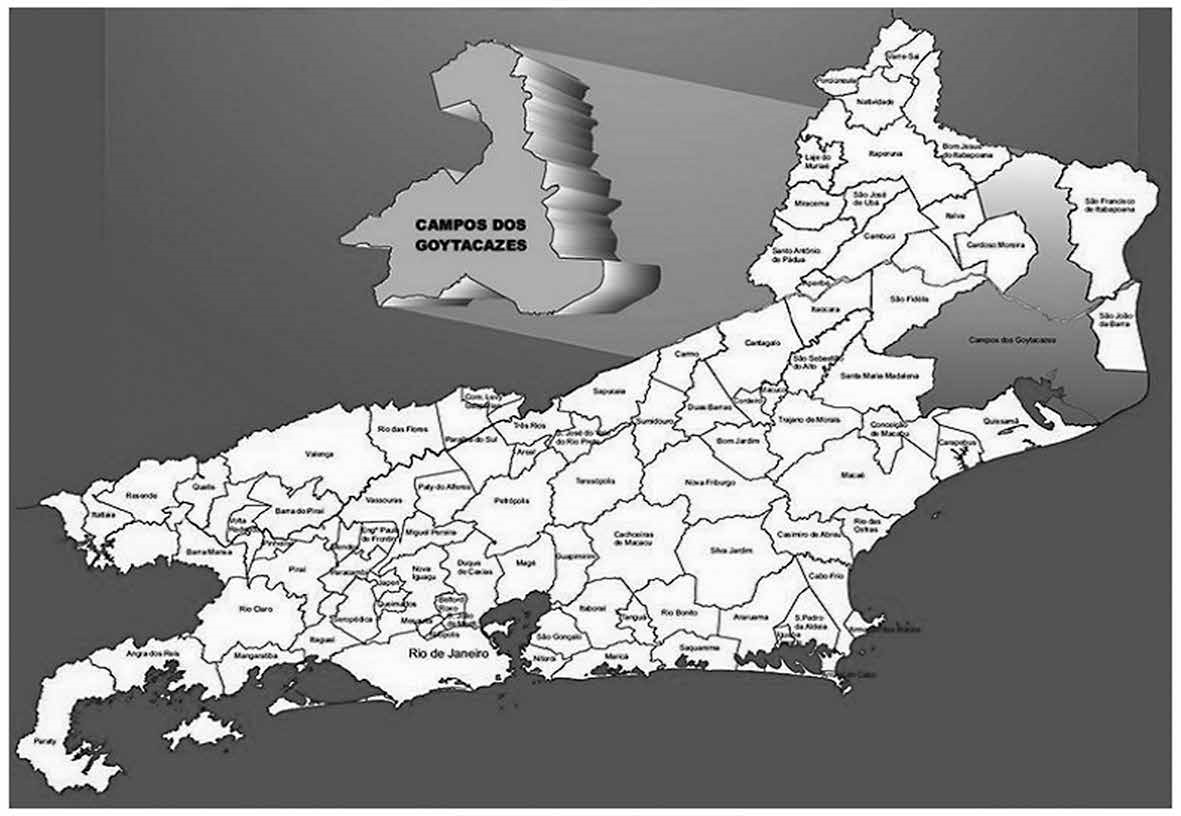Campos dos Goytacazes é o maior município do Estado do Rio de Janeiro em extensão territorial, ocupa uma área de 4.027 km², com 115 habitantes por km² (MONZO et al., 2015), é conhecido geograficamente como a Imensa Planície Goytacá, e está localizado ao norte do Estado (Figura 3). CG também era conhecido até o final da década de 70 e início da década de 80 como Terra do Açúcar, devido às suas inúmeras lavouras canavieiras e usinas de cana-de-açúcar, que eram a base da economia da cidade, desde sua fundação.
