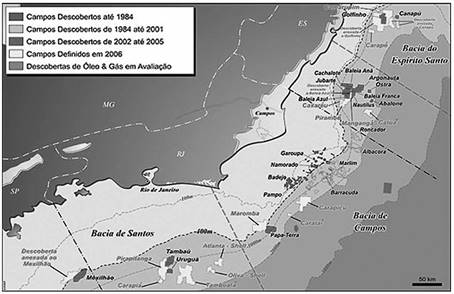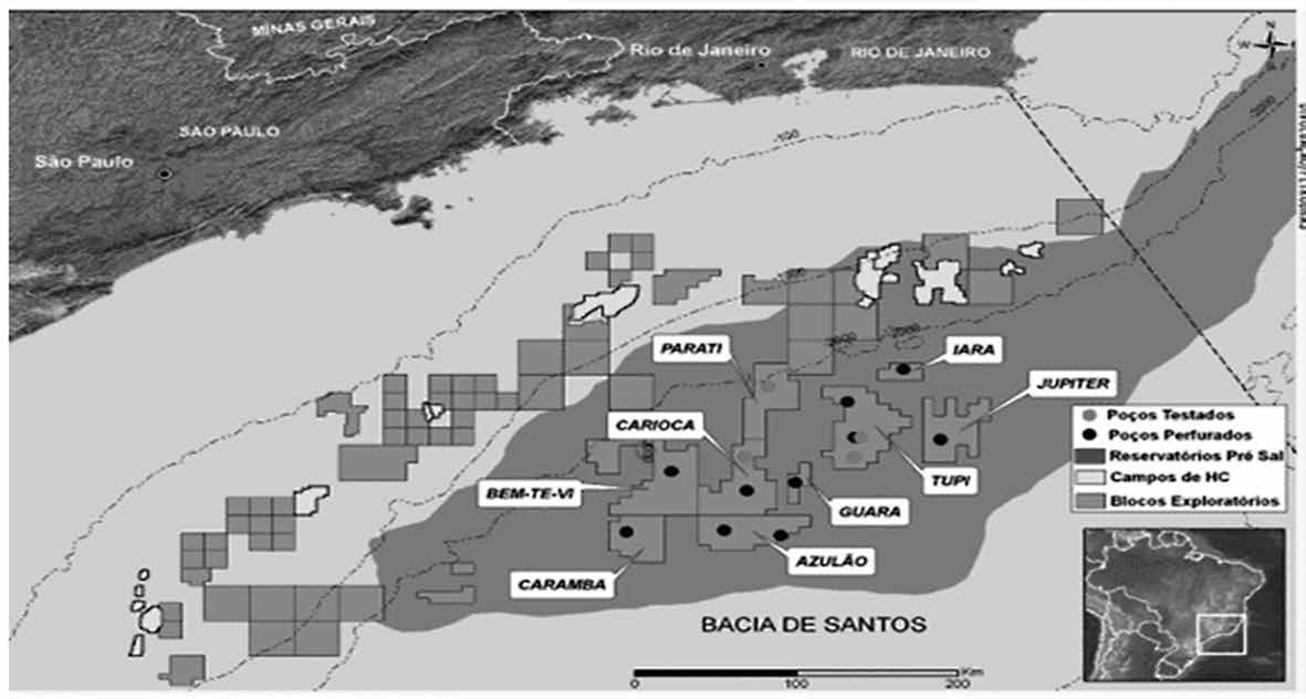 Recentemente as expectativas de crescimento para CG foram fortalecidas pela descoberta de petróleo e gás na região marítima que antecede a camada de sal (Pré-Sal). Localizada na Bacia de Santos (abrange o litoral do Rio de Janeiro e São Paulo) e no Parque das Baleias (Espírito Santo – pertencente à Bacia de Campos), data de 2006 e abrange uma extensão de 800 quilômetros entre os estados do Espírito Santo e Santa Catarina (Figura 5).