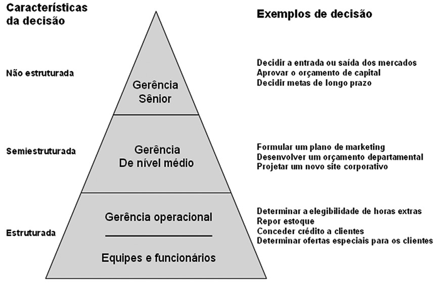 Em cada nível hierárquico de uma organização são tomadas decisões com grau de complexidade diferente. Porém, todas têm sua importância para o sucesso de uma organização. Os SI apoiam essas tomadas de decisões e em cada nível hierárquico são criados de forma a atender as necessidades de dados e informações específicas desses níveis.