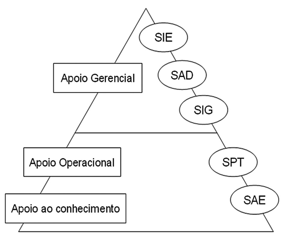 A Figura 3 representa os tipos de sistemas existentes. Nesta figura é possível notar os sistemas que apoiam as tomadas de decisões (Apoio Gerencial) e os sistemas de apoio operacional ou ao conhecimento.