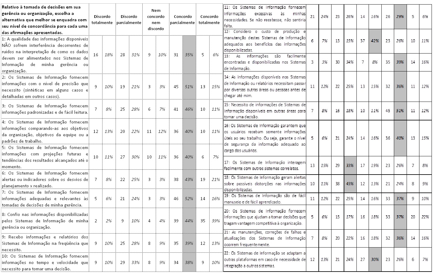 Todas as 22 afirmações contidas no questionário foram elaboradas baseando-se no Quadro 1, no Quadro 2 e no Quadro 3, apresentados na revisão de literatura do presente artigo. Esses quadros apresentam os principais fatores críticos relacionados à qualidade de um SI.