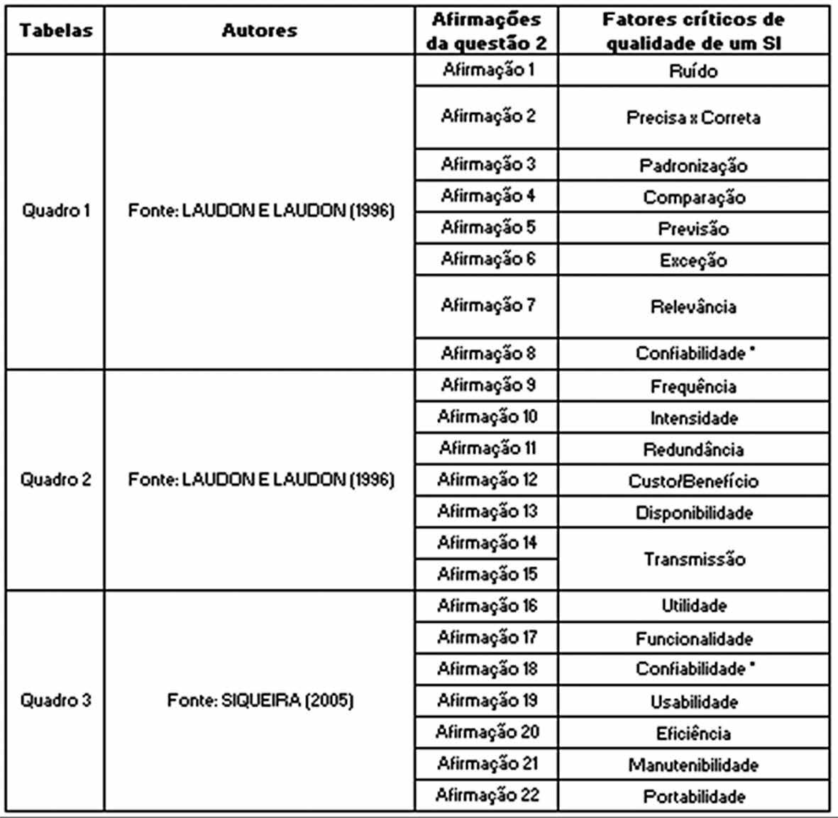 O fator crítico “Confiabilidade” aparece nas citações de Laudon e Laudon (Quadro 1) e de siqueira (Quadro 3), porém refere-se a percepções diferentes. As descrições de cada um dos fatores utilizados foram apresentadas neste artigo nos quadros citados como referência.
