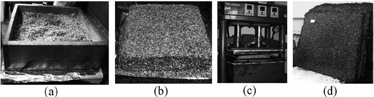 Os painéis com resina poliuretana PUMO foram fabricados no Laboratório de Desenvolvimento de Produtos e Controle de Qualidade da Indústria DURATEX, e os painéis com resina poliuretana PUBI foram fabricados no Laboratório de Madeiras e Estruturas de Madeira (LaMEM), da Universidade de São Paulo (USP). Depois de extraídas as fibras das madeiras de ambas as espécies, a elas foram adicionadas as resinas, e após a mistura mecânica das fases, os compostos foram inseridos em um molde (formador de colchão), sacados destes e levados na prensa hidráulica para formação das chapas (Figura 1).