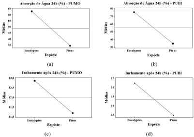 Como o fator espécie de madeira está associado a dois níveis (Pinus e Eucalyptus), acusada a significância pela ANOVA, os maiores valores das propriedades físicas estão associados diretamente aos maiores valores médios, não sendo necessário o emprego do teste de agrupamento por Tukey (três ou mais níveis do fator), revelando ser o Pinus caribaea a espécie de madeira que forneceu os menores valores da absorção de água após 24 horas e do inchamento após 24 horas.