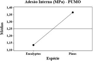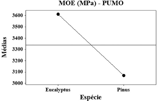 Da Tabela 6, nota-se que as espécies de madeira foram significativas apenas nas propriedades MOE e adesão interna para os materiais fabricados com resina poliuretana monocomponente, sendo equivalentes nas demais propriedades. As Figuras 3 e 4 ilustram os gráficos de efeitos principais do fator espécie de madeira sobre o módulo de elasticidade na flexão e adesão interna respectivamente.