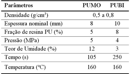 Os parâmetros adotados na fabricação dos painéis elaborados com o uso das resinas poliuretanas PUMO e PUBI estão apresentados na Tabela 1, adaptados do trabalho de Silva et al. (2008). Cabe chamar a atenção de que os parâmetros de fabricação dos painéis com o uso de ambas as resinas foram distintos (testes iniciais). Dessa forma, as análises estatísticas, realizadas com o auxílio da análise de variância (ANOVA), com 5% de significância, foram efetuadas com o intuito de verificar se as espécies de madeira, para um mesmo tipo de resina, foram significativas ou não nas propriedades físicas e mecânicas investigadas, fazendo-se uso do software Minitab® versão 16.