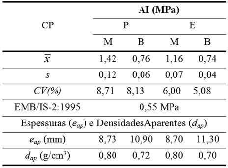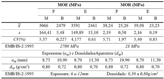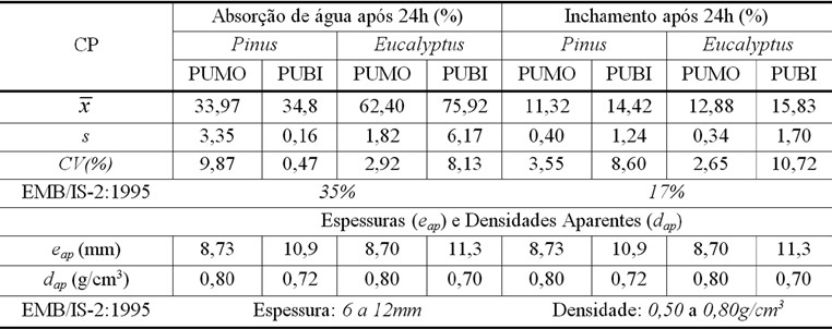 De acordo com os parâmetros experimentais propostos na Tabela 1, para confecção dos painéis com as resinas poliuretanas, observa-se que as densidades e espessuras aparentes estão dentro dos limites propostos pela norma europeia, assim como encontrado nos trabalhos de Dias (2008) e Fiorelli et al. (2011).