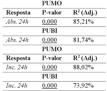 Da Tabela 3 nota-se que os P-valores da ANOVA foram inferiores a 5% em todos os casos, implicando ser significativo o uso das espécies de madeira na obtenção das propriedades físicas, e que os coeficientes de determinação R2 (Adj.) foram superiores a 70%, implicando a boa homogeneidade obtida na fabricação dos materiais (MISSAGIA et al., 2012).