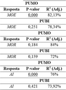 Os resultados da ANOVA sobre a resina PUMO revelaram que a espécie de madeira Eucalyptus grandis apresentou melhores valores de MOE do que os compostos feitos com madeira Pinus caribaea, apresentando comportamento inverso para o módulo de resistência à flexão. Para as demais respostas por tipo de resina, o uso da espécie de madeira mostrou ser não significativo.