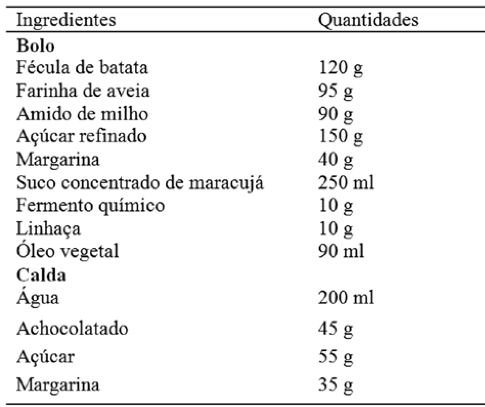 Foi desenvolvida uma receita de um bolo de maracujá com calda de chocolate com baixo teor de fenilalanina conforme demonstrado na tabela 1. A receita foi desenvolvida e testada no laboratório de técnica dietética da Faculdade Redentor - Itaperuna RJ e a análise sensorial do bolo foi realizada no referido laboratório.