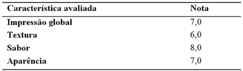 Apesar de o bolo ter os ingredientes tradicionais modificados, é possível notar, de acordo com os resultados, que o bolo obteve boa aceitação, visto que no critério impressão global apresentou nota média de 7,0, considerada pela escala hedônica como “gostei moderadamente”.