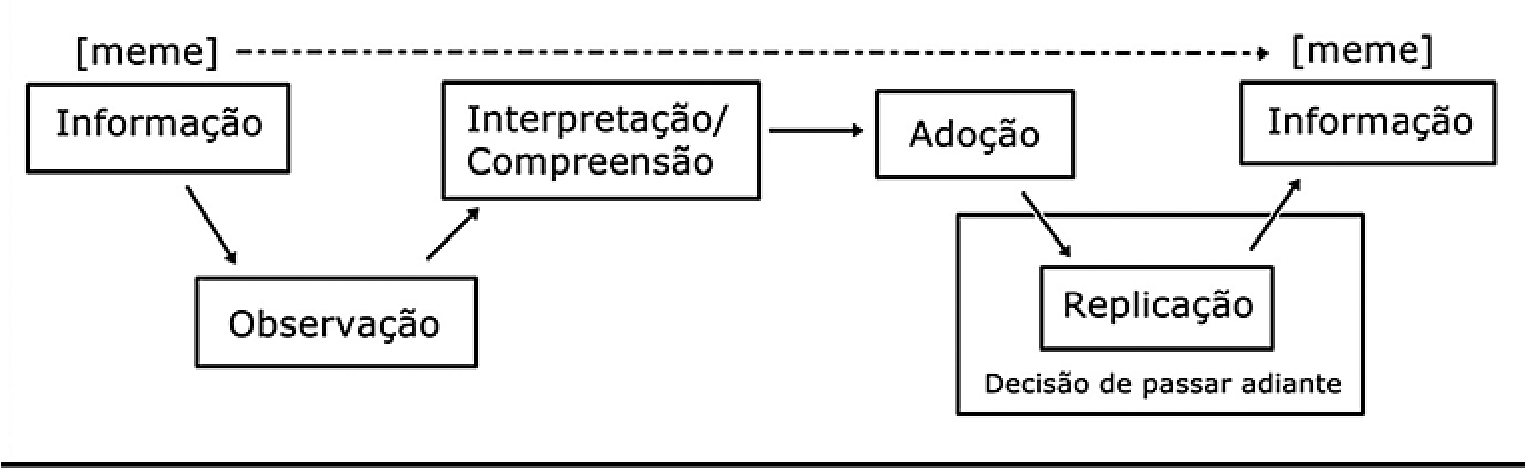 O jogo que se estabelece a partir do uso dessas ferramentas demonstra que os usuários, em interação em rede, adotam uma prática discursiva que vai ao encontro das concepções ideológicas de cada participante dessas relações interativas. Contudo, para que uma informação concretize-se enquanto um “meme”, é preciso que sejam seguidos os passos representados no processo de replicação de “memes”, como mostra a figura 1: