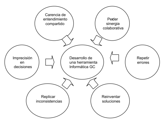 Estas se fundamentan en la carencia de entendimiento compartido, pérdida de la sinergia colaborativa como efecto de la fluidez del equipo, repetición de errores, reinvención de soluciones como efecto de la inaccesibilidad al conocimiento existente, replicar las inconsistencias, imprecisión de las decisiones, carencia de metas compartidas y falta de coordinación en su distribución al utilizar las TIC. Entonces el desarrollo de un sistema y herramienta para la gestión del conocimiento es un objetivo central (ROBEY, 2000, p. 125-155).