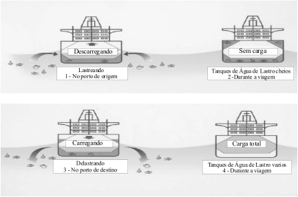 Normalmente, os navios lastram e deslastram antes de partirem de um porto para outro, com o objetivo de compensar a perda ou a adição do peso da carga, sendo justamente aí, que está o grande risco, pois as águas costeiras possuem grandes populações de organismos, muito mais do que as encontradas em alto mar. Mas eles também podem ajustar o lastro em trânsito. Durante as viagens, combustível e água de lastro potável são consumidos, sugerindo a adição da água de lastro ao longo do caminho para ajustar o equilíbrio perdido. Ao chegar ao porto de destino, a água de lastro e toda a biota transportadas são liberadas (Figura 2). Se as condições ambientais forem favoráveis, as espécies introduzidas podem sobreviver, reproduzir e posteriormente, alterar o ecossistema aquático inteiro.