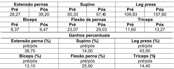 Na Tabela 2, são apresentados os resultados do grupo quanto aos índices de força máxima medidos através do teste de 1RM em kg e o percentual relativo, antes de começar o treinamento (pré-teste) e após 12 semanas de treinamento (pós-teste).