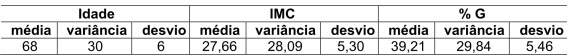 Analisando a Tabela 1, observou-se que o grupo estudado apresentou a média de idade de 68 anos, que está dentro da faixa etária do idoso. O IMC médio de 27,66 kg/m2 apresentado pelo grupo está na classificação de sobrepeso da OMS. A média do percentual de gordura (%G) de 39,21 aponta uma classificação limite para a obesidade mórbida, segundo o ACSM (2000).