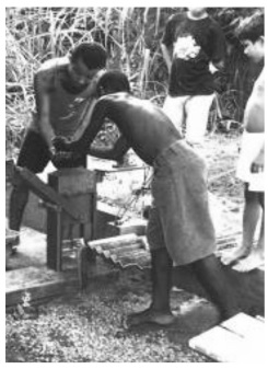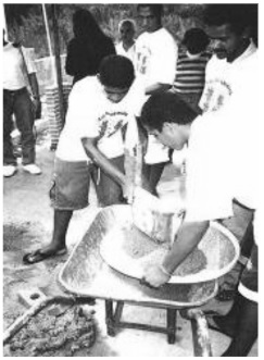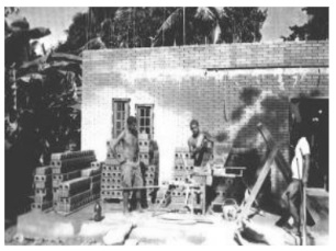 Casanova (2004) relata sobre o projeto Grupo de Estudos Orientados para a Tecnologia de Materiais e Habitação (GEOTEMAH) desenvolvido pela COPPE/UFRJ. Nesse projeto são treinados e capacitados profissionais da construção civil (engenheiros, arquitetos, mestres-de-obras e pedreiros) por meio dos chamados cursos oficina com duração variável, para atuarem como orientadores e multiplicadores. Em regra, a capacitação abrange não somente a fabricação dos tijolos e blocos de solo-cimento e a etapa construtiva, mas também, em casos especiais, a implantação e a gestão do mutirão. Esse apoio estende-se durante todo o período de execução e contempla o acompanhamento de todo o processo desde a produção até a construção, incluindo a possível formação de uma cooperativa (Fotos 1, 2, 3 e 4).