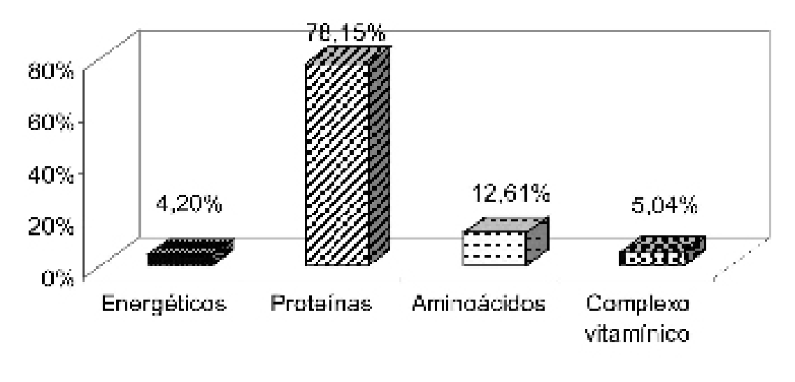 Os suplementos mais utilizados neste estudo foram as proteínas (78,15%) (Figura 8). Esta prevalência da utilização de proteínas, provavelmente, se justifica por ser o suplemento mais conhecido como sendo capaz de aumentar a massa muscular, que é o desejo da maioria dos usuários de suplementos. Estes dados corroboram com os dados obtidos por (ARAÚJO; SOARES, 1999, apud ARAÚJO et al., 2002, p. 15), em que o suplemento mais utilizado pelos desportistas foi à base de proteínas e aminoácidos (27%). Segundo Araújo et al. (2002, p. 15) a ingestão excessiva de proteínas e aminoácidos por meio da alimentação ou da suplementação protéica tem trazido efeitos danosos ao organismo. Proteínas em níveis superiores a 15% das calorias totais pode levar ao quadro clínico de cetose, gota e sobrecarga renal. Este excesso de proteínas pode, ainda, segundo Margen et al. (1979, apud ARAÚJO et al., 2002, p. 15) promover aumento da gordura corporal, desidratação, balanço negativo de cálcio e induzir à perda de massa óssea.