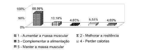 A utilização de Suplementos alimentares, freqüentemente, está associada aos benefícios que estes proporcionam, isto é, aos desejos que os usuários querem alcançar. Neste trabalho, dentre os indivíduos que utilizam suplementos, 69% o fazem com o intuito de aumentar a massa muscular (figura 9). Os mecanismos pelos quais os suplementos agem para promover este ganho de massa muscular variam de acordo com o tipo de suplemento. Segundo o trabalho de Araújo et al. (2002, p. 15) a suplementação com creatina pode aumentar a massa muscular, a força e a capacidade aeróbica nos exercícios de alta intensidade. O aumento da massa muscular pode ser resultado da síntese de ptns miofribrilares e da hipertrofia das células musculares, mecanismos estes que, provavelmente, contribuem para o aumento da força muscular.