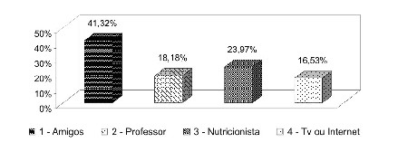 Quando foram questionados sobre a orientação utilizada para o uso de suplementos, os mais citados foram os amigos (41%) seguidos de nutricionistas (24%), professores ou instrutores (19%) e Tv ou internet (17%). São dados preocupantes porque a percentagem das orientações indevidas é muito grande se comparadas com a orientação de um nutricionista, que é um profissional especializado. Segundo Pereira et al. (2003, p. 270) a fonte mais utilizada foi a de professores e instrutores (31,1%) seguida pela orientação dos amigos (15,6%), ficando em menor percentagem a orientação por nutricionista (10%). Em estudo feito por Rocha et al. (1998, p. 323) dos 32 alunos que foram orientados, 41% foram por profissionais de saúde e os 59% restantes foram por instrutores, amigos, consultas sobre o assunto. Contudo, no estudo realizado por Araújo et al. (2002, p. 270) a orientação para uso de suplementos foi, na maioria, feita por nutricionistas ou professores.