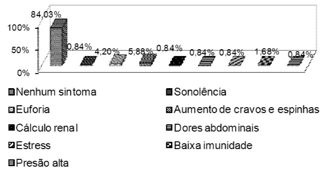 O sintoma mais observado foi o aumento de cravos e espinhas, que perfez um total de 5,88% dos usuários de suplementos. Outro sintoma bastante relatado foi o aumento da euforia, em 4,2% dos usuários de suplementos alimentares.