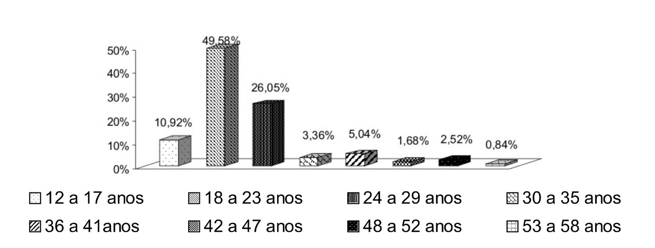 A variação de idade entre os usuários de suplementos alimentares nas academias de Campos dos Goytacazes foi de 12 até os 58 anos de idade com maior incidência entre 18 a 23 anos o que representou aproximadamente 49,58% dos usuários (Figura 5). Outra faixa etária em que se percebe muita utilização de Suplementos foi entre 24 a 29 com 26,05% de usuários. O trabalho de Araújo et al. (2002, p. 15) mostrou que nas academias de Goiânia a faixa etária em que se observou maior utilização de suplementos foi de 18 a 20 anos e de 21 a 23 anos, embora não tenha sido observada diferença estatisticamente significante entre dados.