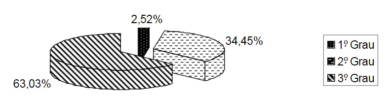 A Figura 6 nos mostra que a maioria dos usuários de suplementos alimentares nas academias de Campos dos Goytacazes possui nível superior (63%). Os usuários que possuem 2° grau correspondem a uma percentagem de aproximadamente 34%, um índice bastante representativo. Somente 2,5% dos usuários de suplementos nas academias de Campos dos Goytacazes possuem o 1° grau.