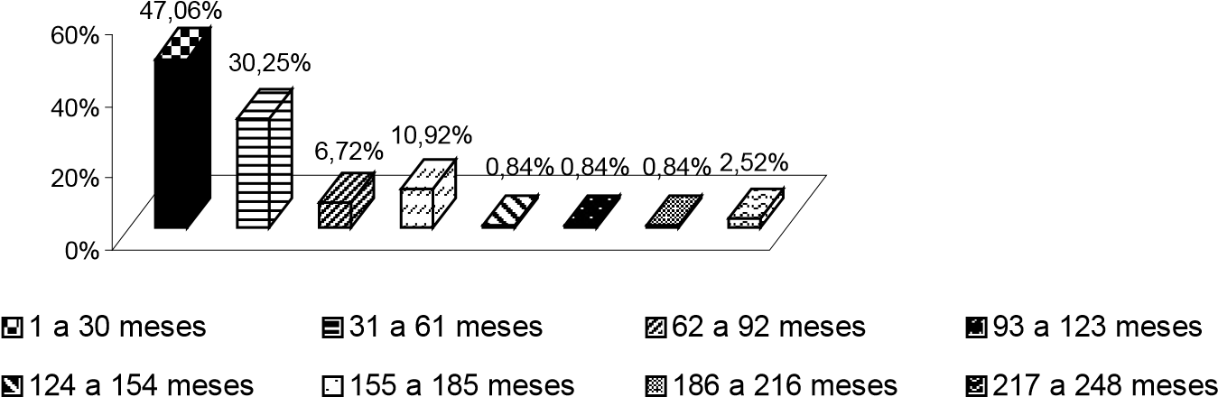 A Figura 7 nos permite concluir que 47% dos usuários de suplementos alimentares na cidade de Campos dos Goytacazes praticam musculação entre 1 semana a 2 anos e meio. 30% aproximadamente dos usuários de suplementos malham no período que varia de 2 anos e 7 meses a 5 anos e 1 mês. 11% dos usuários malham no período entre 7 anos e 9 meses e 10 anos e meio. A percentagem de pessoas que malham mais de 10 anos e meio é bem menor como nos mostra a Figura 7.