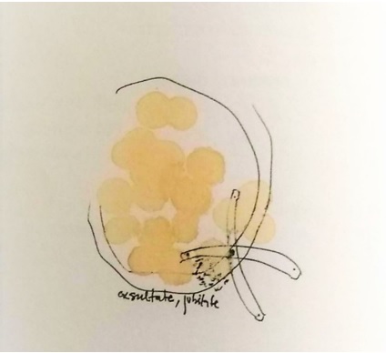 Em diálogo com o poema “O MABOQUE”, vê-se uma imagem do fruto, original de Angola, da região Sul do continente africano. O fruto é amarelado por fora, marrom por dentro e possui uma casca dura que precisa ser quebrada para chegar ao núcleo. É um fruto de sabor e aroma intensos. É comum adicionarem-se hastes à casca seca para utilizá-la como recipiente de sementes, por exemplo. As palavras abaixo do desenho dizem “exsultate, jubilate”. Já o detalhe ao lado esquerdo, possivelmente imitando as hastes, aparece acompanhado de pontilhados que lembram pelos. O texto do poema fala de desejo, libido. O uso do verbo “comeu” neste contexto tem nuances literais e mais abstratas. É possível comer o fruto, e também experimentar, saborear o desejo. Comer, no contexto sexual, remete à penetração de orifícios do corpo com intenção de satisfazer a uma pessoa. A imagem traz um ponto que lembra um orifício e pontos menores que lembram pelos. O poema coloca uma provocação intensa como o sabor do fruto: é preciso dar vazão ao desejo, pois ele faz parte da vida e da condição de habitação de um corpo. Há também uma intencionalidade interessante na escolha do fruto. Uma casca dura, difícil de quebrar, alude a uma parte da existência humana feminina difícil de acessar.