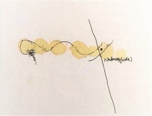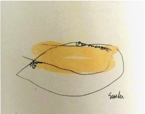 O desenho associado a este texto mostra fios e manchas, e ao fim do seu caminho de ondas, as duas linhas que se formam em paralelo são cortadas por uma outra. Um ponto se apresenta do outro lado da linha de corte, e duas linhas abertas e paralelas apontam para um espaço aberto, de variados caminhos possíveis. Neste texto, Tavares trabalha com o erótico de uma maneira misteriosa e distinta em relação a outros exemplos aqui apresentados. Há, ao longo do livro, dimensões do erótico que exploram diversas áreas da vida e da existência do corpo feminino.