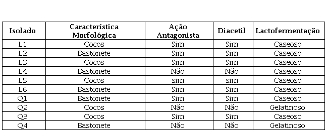- Quatro cepas (L1, L3, L5 e Q3) com morfologia tipo cocos apresentaram ação antagonista contra L. monocytogenes, produção de diacetil e lactofermentação tipo caseosa.