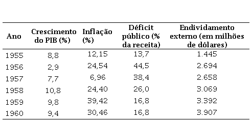 Muitos estudos mostram as consequências socioeconômicas trazidas pela política de JK: endividamento externo e interno, inflação, concentração econômica, ampliação do número de multinacionais (principalmente americanas), dentre outras. Cedro (2019) afirma que, para atrair o capital privado, o Estado concedeu condições fiscais, cambiais e creditícias que asseguraram a importação de equipamentos para os setores priorizados pelo Plano de Metas. Ademais, o governo garantiu ao empresariado nacional sustentar um alto nível da demanda interna e assegurar mercados competitivos aos seus produtos. Os dados da Tabela 1 expressam a economia nacional do período JK.