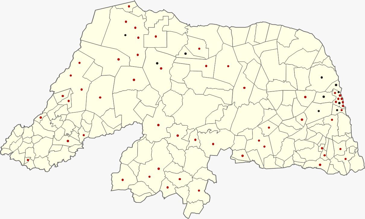 Na Figura 1, é apresentada uma visão panorâmica da distribuição geográfica das 53 escolas de educação profissional (identificadas no mapa pelos pontos na cor vermelha) e dos dez CEEP (representados pelos pontos na cor preta).