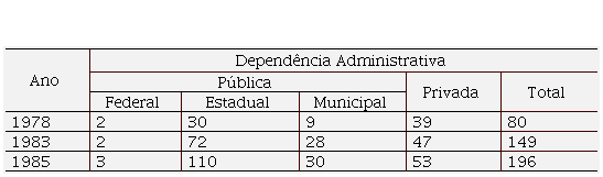 Segundo Medeiros et al. (1988), o ensino profissionalizante na Rede Estadual de Educação do Rio Grande do Norte (REERN) foi marcante nos anos de 1978, 1983 e 1985, coincidindo com o momento em que as modificações legais dos instrumentos reguladores do ensino de 2.º grau eram introduzidas em âmbito nacional. Na Tabela 1 está representado o número de estabelecimentos de ensino de 2.º grau, por dependência administrativa, no estado do Rio Grande do Norte, nos referidos anos.