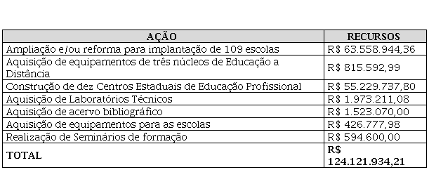 Como se pode perceber, quase a totalidade dos recursos conveniados – R$ 118,8 milhões (96%) – foram destinados a obras de ampliação e/ou reforma de 109 unidades escolares e à construção de dez Centros Estaduais de Educação Profissional (CEEP), restando apenas R$ 5,3 milhões (4%) dos recursos, para as demais ações conveniadas.