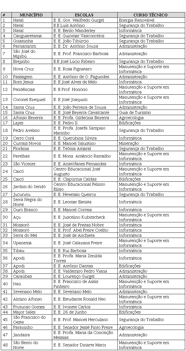 Os critérios para a seleção das 109 unidades escolares foram, além da localização geográfica (com a intenção de interiorizar a oferta da educação profissional na REERN), a dominialidade (direito patrimonial) das escolas e a proposta da oferta de cursos técnicos vinculados aos arranjos produtivos locais (APL) (sistema complexo de articulações de empresas com sinergia coletiva e que operam em conjunto com o governo, associações, cooperativas e instituições de ensino e pesquisa), de forma a contribuir com a ampliação da economia local e regional.