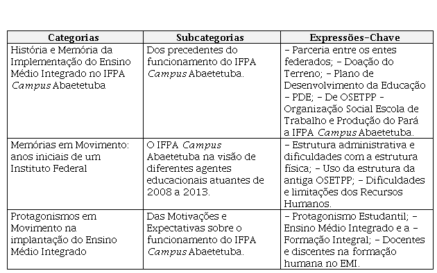 Referenciando-se nas etapas de análise do conteúdo proferidas por Bardin (2016), elaboramos o Quadro 1 onde estão dispostas as categorias, subcategorias e expressões-chave mais comumente encontradas nas fontes analisadas.
