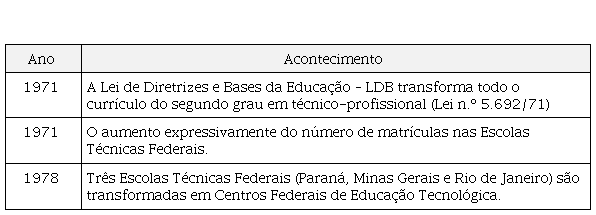 Entre as décadas de 80 e 90 do século XX, o Brasil foi marcado por um grande descontrole da economia e essa situação contrariou as expectativas da década de 70 de formar técnicos em larga escala. A economia mundial se modificou e, juntamente, com ela as instituições federais de educação profissional e tecnológica também ensaiavam mudanças, conforme assinalam Moura, Garcia e Ramos (2007, p. 15), ao afirmarem que “a profissionalização obrigatória vai desvanecendo-se, de modo que ao final dos anos 1980 e primeira metade dos anos 1990 […] ocorre no Congresso Nacional o processo que culmina com a entrada em vigor de uma nova LDB, a Lei n.º 9.394/1996.”