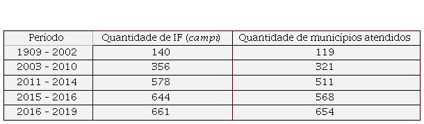 Um dos objetivos dos institutos federais é o de promover melhorias na vida da população que vive em seu entorno, além de proporcionar uma educação de caráter emancipatório. Na segunda fase de expansão, intitulada “Uma escola técnica em cada cidade-polo do país”, ocorrida entre 2007 e 2010, a meta era que fossem construídos 150 novos campi, totalizando a criação de 180 mil vagas. Na terceira fase (2011 a 2014), ocorrida durante o governo de Dilma Rousseff, foram finalizados 208 campi. Assim, a Rede Federal contava com 562 unidades no país. Em 2019, já eram mais de 661 unidades em atividade. No Quadro 2 está demonstrada a quantidade de institutos e sua distribuição por municípios até o ano de 2019.