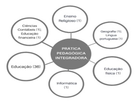 Observa-se na Figura 3 que as práticas pedagógicas integradoras têm sido discutidas em campos bem heterogêneos, tais como: Educação, Informática, Educação Física, Ensino Religioso, Geografia, Língua Portuguesa, Ciências Contábeis e Educação Financeira. Essa maior amplitude de espaços de debates também se conecta à pluralidade de possibilidades de publicação sobre a temática.