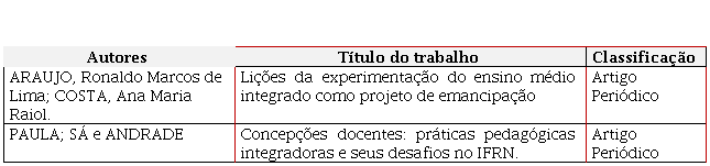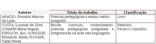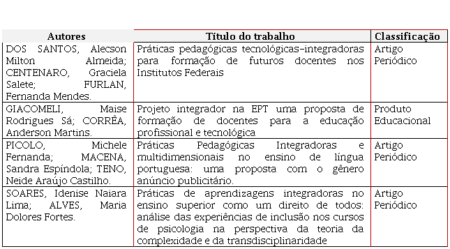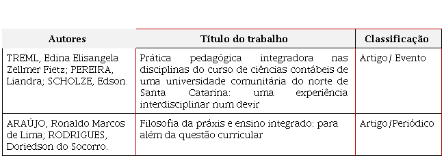 Os dois trabalhos contidos no Quadro 1 possuem características distintas. O primeiro relata uma experiência pedagógica integradora vivenciada por docentes e discentes do Curso de Ciências Contábeis de uma universidade comunitária do norte de Santa Catarina. Já o segundo tem um cunho epistemológico no debate sobre as Práticas Pedagógicas Integradoras.