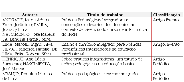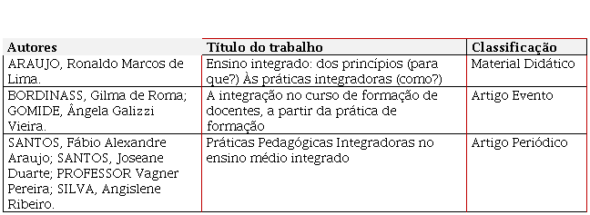 Em todos os trabalhos analisados percebeu-se que a prática pedagógica integradora remete à ideia de práxis como referência às ações formativas. Nesse sentido, tais práticas requerem a constituição de um ambiente material que a favoreça e da busca permanente pelo elemento integrador, considerando as realidades específicas, a totalidade social e os sujeitos envolvidos.