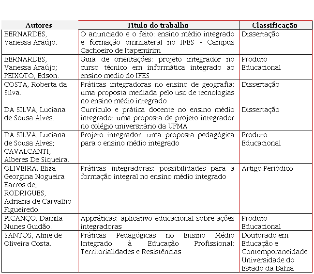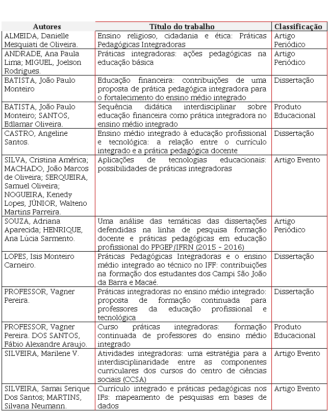 Quanto ao estado do conhecimento apresentado, este permitiu a identificação, o registro, a categorização dos trabalhos sobre a temática em questão, bem como levou à reflexão e síntese sobre a produção científica das Práticas Pedagógicas Integradoras, a qual tem se conectado conceitualmente com as ideias de formação humana integrada, baseada em princípios emancipatórios. De mesmo modo, apontou para a necessidade de experiências educativas marcadas pela aprendizagem colaborativa, interdisciplinaridade e abertura para a diversidade no contexto da EPT.