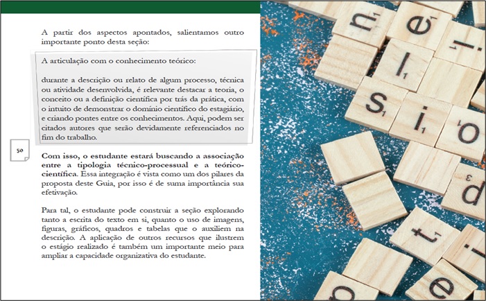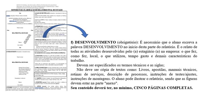 A descrição contida no roteiro enfatiza o relato das atividades realizadas pelo discente, considerando o que foi desenvolvido na empresa na qual ele atuou. É oportuno observar os elementos próprios da tipologia narrativa que o roteiro destaca, isto é, “o que o estagiário fez”, “como fez”, “quando fez” e “onde fez”. Outra orientação se dirige para o uso da linguagem técnica na produção do texto e o alerta para que não ocorram reproduções explícitas de outras obras, o que implicaria plágio.